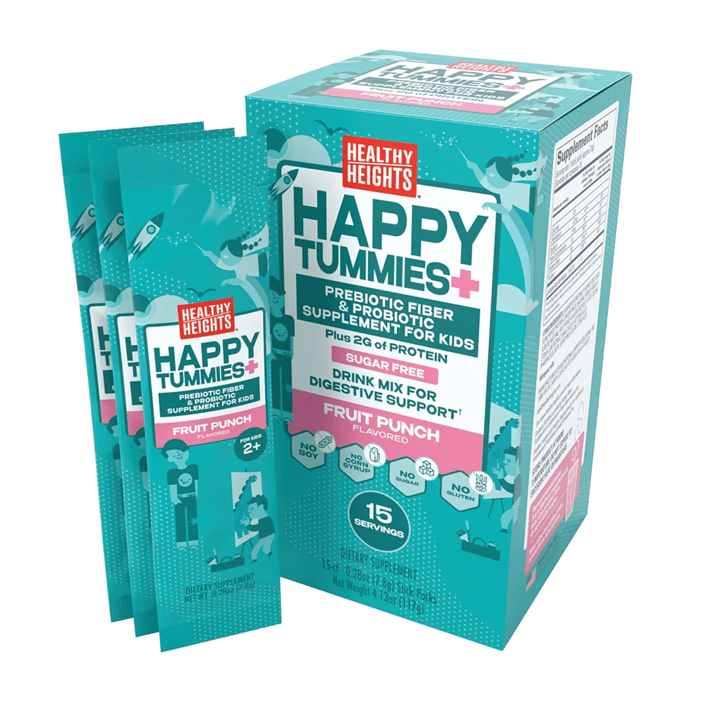 Healthy Heights® Happy Tummies Prebiotic Fiber and Probiotic Supplement supports your child's digestive health and wellness with 4 grams of Sunfiber®, 2 grams of protein and 5 billion CFU of Lactobacillus rhamnosus in every serving. Made for children ages 2-13, this dissolvable fruit punch-flavored powder provides gentle, effective support for gut health and regularity. Sunfiber® premium soluble fiber, has been clinically shown to improve gut health and aid digestion by promoting the growth of beneficial bacteria, supporting digestive comfort and regularity. Its easy-to-digest formula helps maintain regular bowel movements and a balanced digestive system, ensuring your child feels their best every day. With Happy Tummies, you can provide your child with the nutritional support they need, without any unnecessary additives. Our prebiotic fiber supplement and protein for kids is soy-free, gluten-free, contains no corn syrup, and has no sugar. Use daily to maintain gut health or as needed to relieve occasional stomach discomforts, like digestive upsets and diarrhea. These ingredients also play a vital role in restoring essential gut flora after antibiotic use, helping balance your child's digestive system. Simply mix a packet of this fruit punch flavored fiber for kids into water, juice, or their favorite drink—or even stir it into plain yogurt or applesauce. Allergens: Milk.